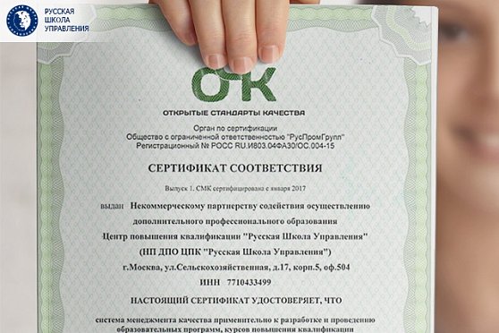 В 2013 году системе менеджмента качества Русской Школы Управления впервые был выдан сертификат соответствия требованиям международного стандарта ИСО 9001, в котором изложены требования к системе управления качеством в организации. С тех пор СМК Школы многократно проходила инспекционный контроль и внешний аудит.